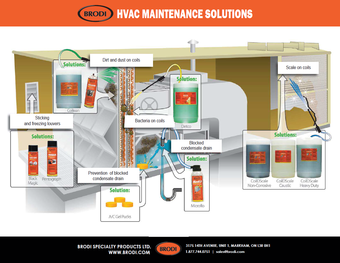 Brodi's HVAC products provide a proactive approach to HVAC and plumbing upkeep. Preventative mechanical maintenance avoids shutdowns, damage and expensive repairs in the future. Our unique line of speciality products have been carefully curated utilizing our extensive knowledge gained from over 45 years of business. From no-rinse coil descalers to condensate drain treatments, we have many easy to use solutions. Check out our catalogue below.